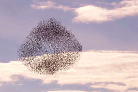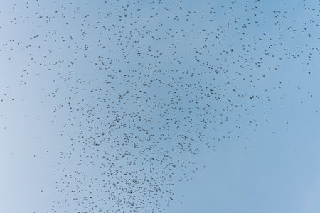 Flock of starling birds swarming at the sky, large group of animals as natural pattern