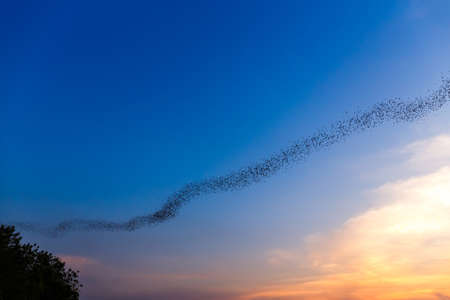 A flock of starlings flying in the sky at sunset. A flock of starlings is flying in the sky.