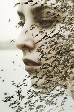 A woman's face is covered in birds, creating a surreal and dreamlike effect. Concept of chaos and confusion, as the birds seem to be everywhere and in every direction