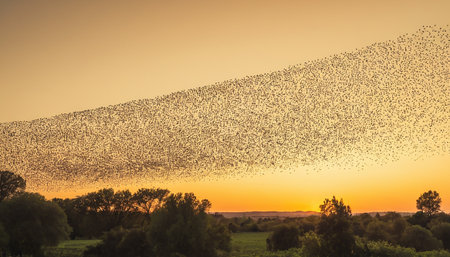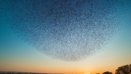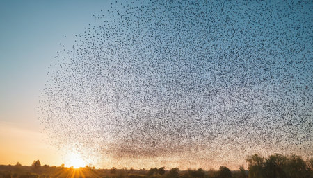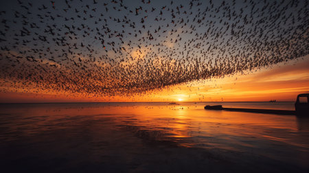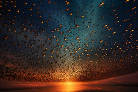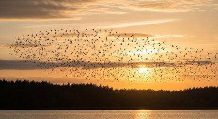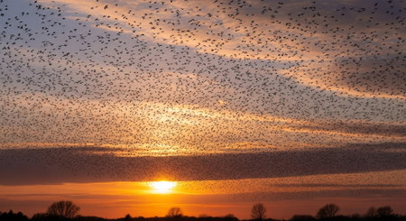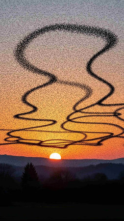 A breathtaking display of a swirling flock of birds against a dramatic sunset sky, showcasing nature's exquisite beauty and dynamic movement in the evening light.