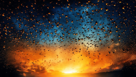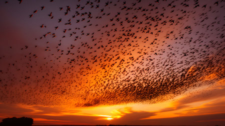 A flock of birds is silhouetted against a vibrant sunset. The composition showcases a fiery gradient of orange and red hues in the sky. The image has a painterly style with diffused lighting and an atmospheric perspective. Suitable for various editorial and commercial applications.