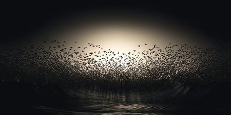 A stunning visual capturing a flock of birds in flight against a dark and abstract background. The scene evokes feelings of freedom, movement, and tranquility. Perfect for creative projects and artistic endeavors.