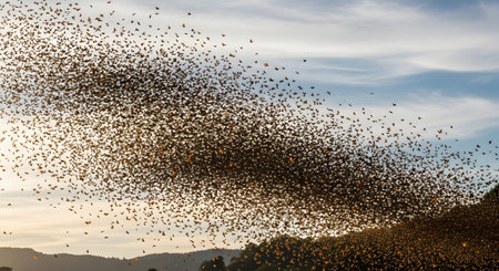An awe-inspiring sight of a massive swarm of Monarch butterflies fluttering in the air, creating a beautiful, dense cloud against a soft blue sky with wispy clouds. The sheer number of insects highlights the scale and wonder of their annual migration.
