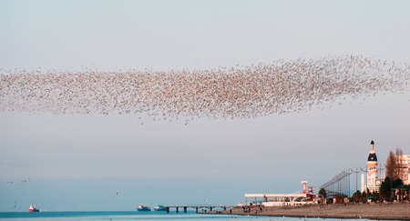 Flock of starlings flying in the sky at sunset. A flock of starlings fly in the sky.