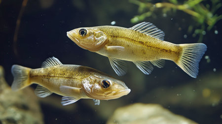 Two freshwater fish swim gracefully in a clear aquatic environment, showcasing their natural colors and movements among rocks and greenery during daylight.