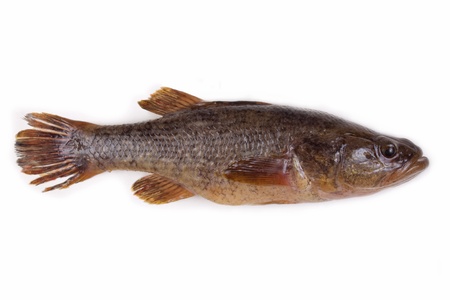 A detailed close-up of a fishs head, showcasing its eye, mouth, and scales against a clean white backdrop.