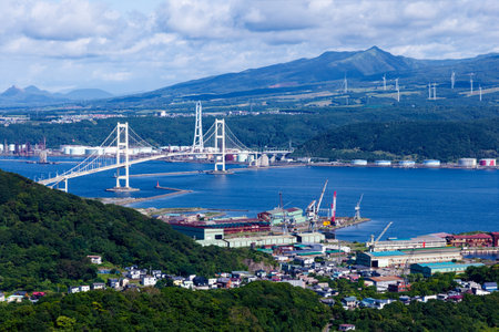 View of PetropavlovskKamchatsky City Avacha Bay and Pacific Ocean from the top in autumn. Russia Far East Kamchatka Peninsula.