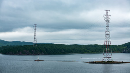 Vladivostok, Russia, 2017 - The ship stands on the roadstead during sunset in the Golden Horn Bay