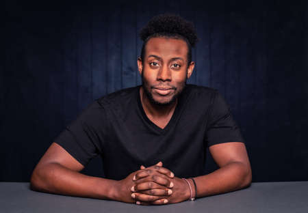 Dramatic medium closeup of a young Black adult male wearing a crisp white cotton t-shirt, photographed with deep shadows and high contrast against an isolated black backdrop.
