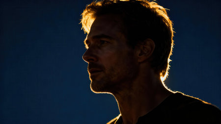 Somber adult Caucasian man shrouded in deep shadows, highlighted by intense golden backlight creating a stunning rim effect against the profound navy blue background, emphasizing profile details.