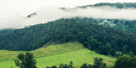 Trees and mountains near Springbrook in Queensland on a cloudy and rainy day.