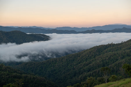 Sunrise scene at the high mountain. Sea Cloud, and fog, Doi Luang, Chiang Dao, Chiang Mai, Thailand. View from the high mountain, Ban San Pa Kia High Mountain Agriculture.