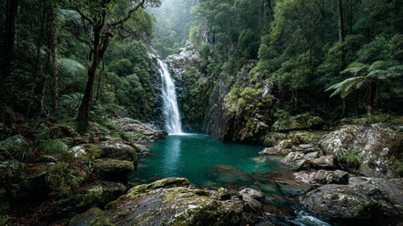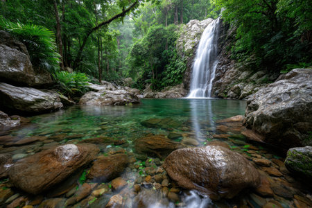 A waterfall cascades into a crystal clear pool in a lush tropical rainforest
