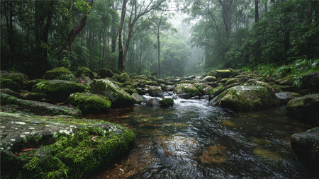 Mossy rocks and stream in the rainforest, Thailand.