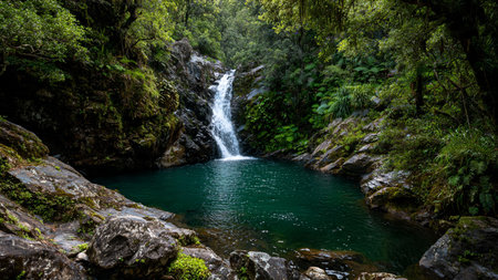 Beautiful greenery nature and waterfalls in a rainforest, Abel Tasman National Park, New Zealand. Vintage faded color effect.