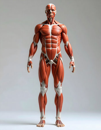 Delve into the intricacies of human anatomy with an illustration showing a standing male body, revealing the intricate details of muscle tissues on display.