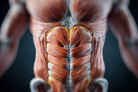 An intricate illustration showing the layered anatomy of torso musculature, emphasizing abdominal and adjacent muscle structures for educational use.
