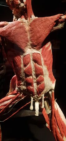 Kyiv, Ukraine - December 09, 2019: Close up detailed view of human body with different positions on famous exhibition Body Worlds (shows human body with muscles)