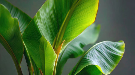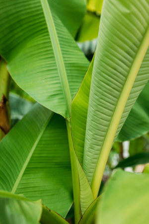 Close-up of vibrant green banana leaf showing detailed vein structure and natural textures. Perfect for eco-friendly branding, wellness concepts.