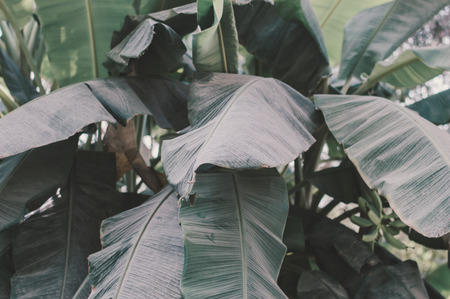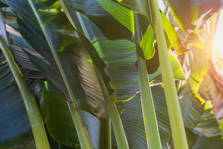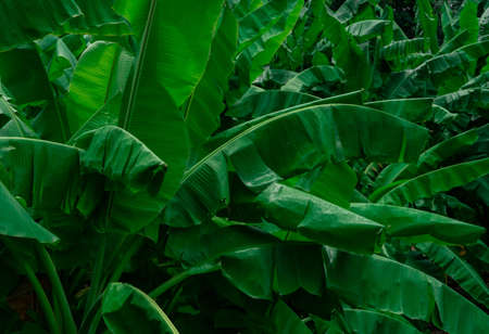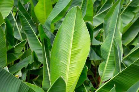 Horizontal background with big banana leaves growing in rainforest. Tropical leaves texture. Green leaf