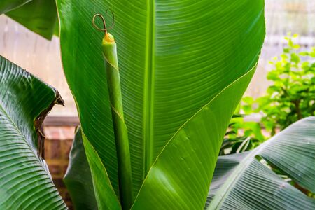 closeup of the leaf of a banana plant with a folded leaf, popular tropical plant specie