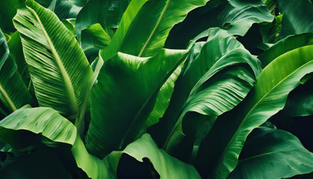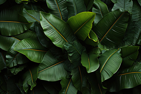 Lush green banana leaves overlapping, detailed veins and textures, tropical rainforest background generative ai