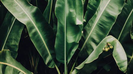 Broad banana leaves tower above, illuminated by soft daylight. The vibrant green foliage creates a natural canopy, enhancing the tropical atmosphere. A serene scene of natures beauty unfolds.