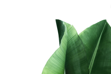 Fresh green banana leaves on white background, top view. Tropical leaves