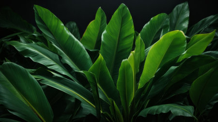 Banana green leaves on dark background. Banana leaf in tropical garden. Green leaves with beautiful pattern in tropical jungle. Natural plant in tropical garden. Nature background. Greenery wallpaper.