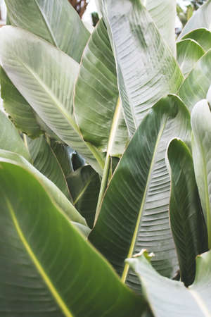 Strelitzia retinae foliage, Bird of paradise foliage Tropical leaf texture in garden