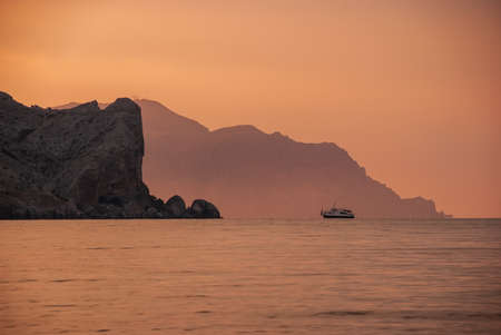 View from Cape Chameleon in Crimea to the Dead Bay. Sunset, blue sky.