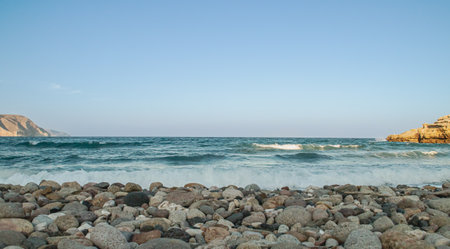 Cuervo cove beach in Las Negras, Almeria, Spain. Waves on a beach of huge pebbles, at sunset on a calm summer afternoon.