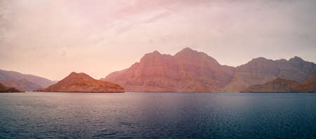 Panorama of idylic sunset over Fjords near Khasab in Oman