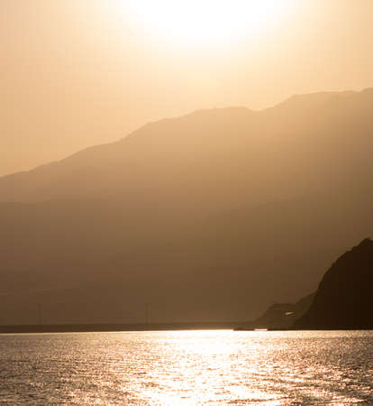 Twilight on the island of Crete with view to Spinalonga with a foggy horizon, sea coast, rocks and stones on a summer morning.