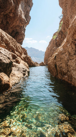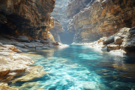Turquoise water meanders through a rocky canyon surrounded by sheer walls, illuminated by midday sunlight creating a tranquil atmosphere in nature.