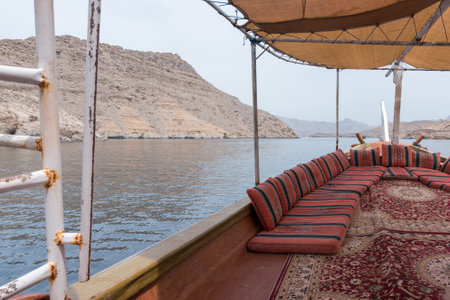 Traditional tour boat on water on cruise in persian gulf. Oman travel famous leisure activities