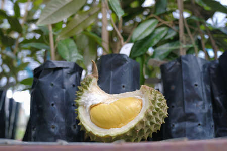 Musang King or King of Fruit From Malaysia. Close up shot of young baby durian tree and durian seed in farm nursery.in farm nursery