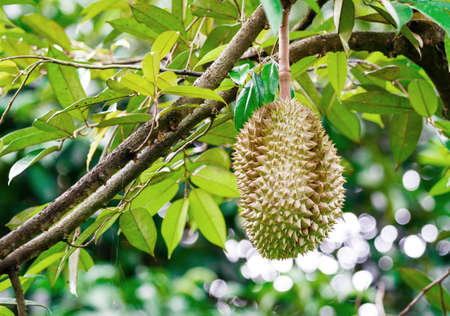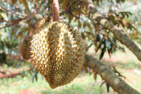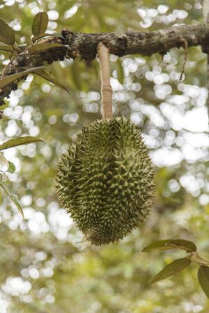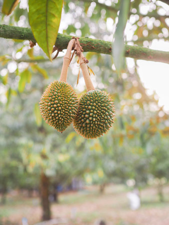 Fresh organic green Durian fruit hanging from branch on Durian tree garden and healthy food concept