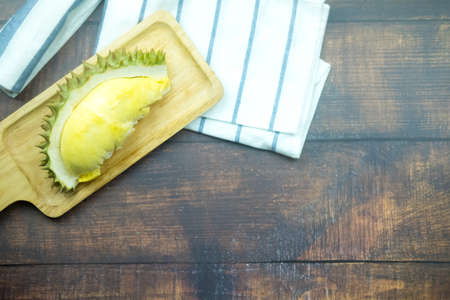 Fresh durian on wooden tray. Ready served of ripe durian. the most delicious duriran of Thailand is in peel and peel off.