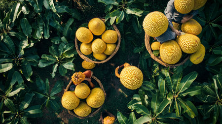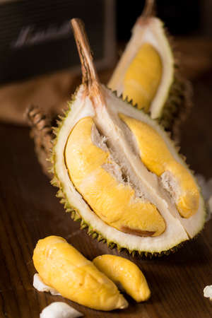 Close up durian the king of fruit in Thailand on wooden basket.Summer tropical Thai traditional fruits so delicious,spiky peel,sweet and good smell. Ripe durian has been peel yellow gold color.