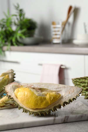 Piece of fresh ripe durian on gray table in kitchen, space for text