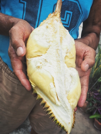 Musang King or King of Fruit From Malaysia. The hand holding durian peels, durian yellow meat and eat very fresh. Hand show the Musang King in farm nursery