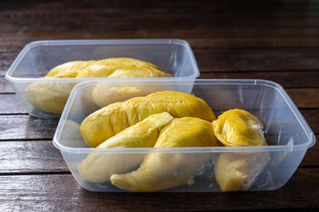 Golden yellow musang king durian pulp flesh in two containers on wooden surface
