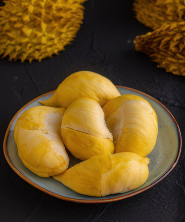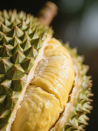close up shot on durian, sweet king of fruits on dark background, vegetable for diet with nutrition ingredient concept.