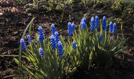 Clusters of vibrant blue grape hyacinths stand tall in a green garden, basking in the warm sunlight of spring. The delicate flowers add beauty to the surrounding landscape.