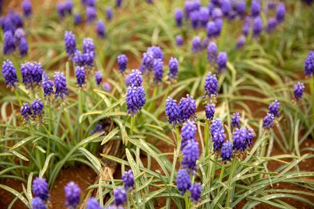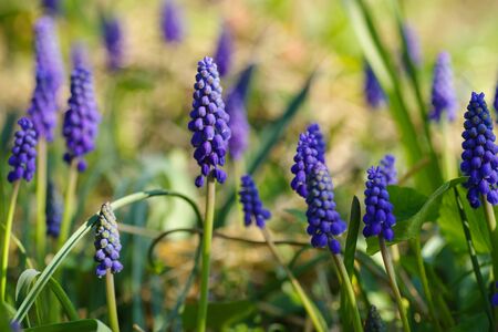 purple muscari Muscari Armeniacum Viola. Many muscari blue flowers in green. Spring muscari hyacinth flowers. Beautiful Blue spring holiday nature background with blue blossoming flowers closeup
