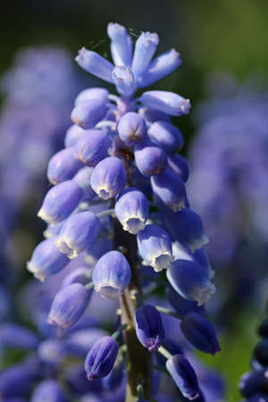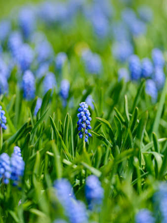 Muscari beginning to blossom, opening buds, focus on closest flowers, background blurry, close up, sunny spring day
