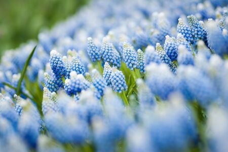 Many muscari blue flowers in green. Spring muscari hyacinth flowers.