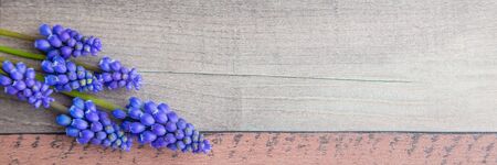 landscape natural with flowers Muscari, on a gentle soft toned on blue and pink background outdoors close-up macro