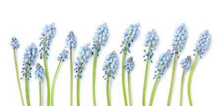 Group of lovely, compact china-blue grape hyacinths (Muscari azureum) with long, bell-shaped flowers and green leaves in early spring with white background